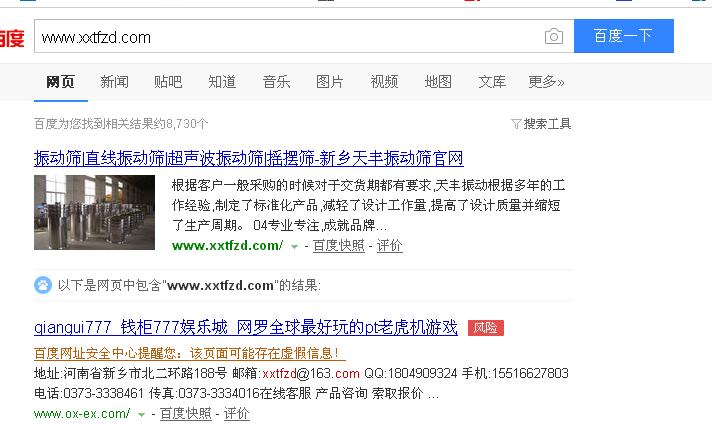 第二條信息,下面的地址,郵箱啊等等資料都是我們新鄉(xiāng)市天豐振動機械公司的,但是打開內(nèi)容,卻是一個很不的網(wǎng)站,我查看了一下源代碼,沒有我們公司的,這是什么情況呢,然后我又看百度快照信息,結果如下: